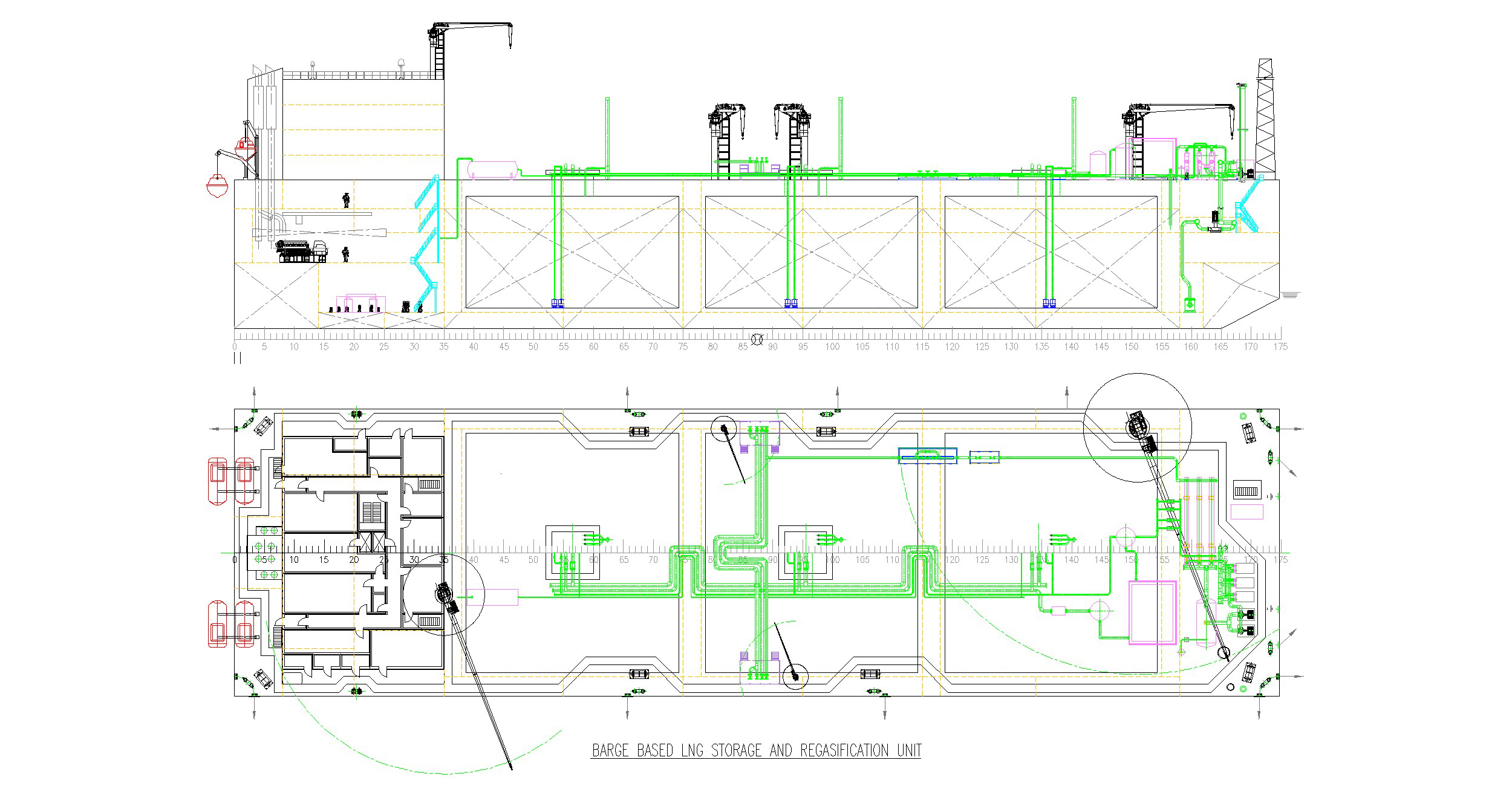Scope of work: Basic Engineering of floating barge with complete topside regasification system with associated machinery, power system for in principal approval from Bureau Veritas.