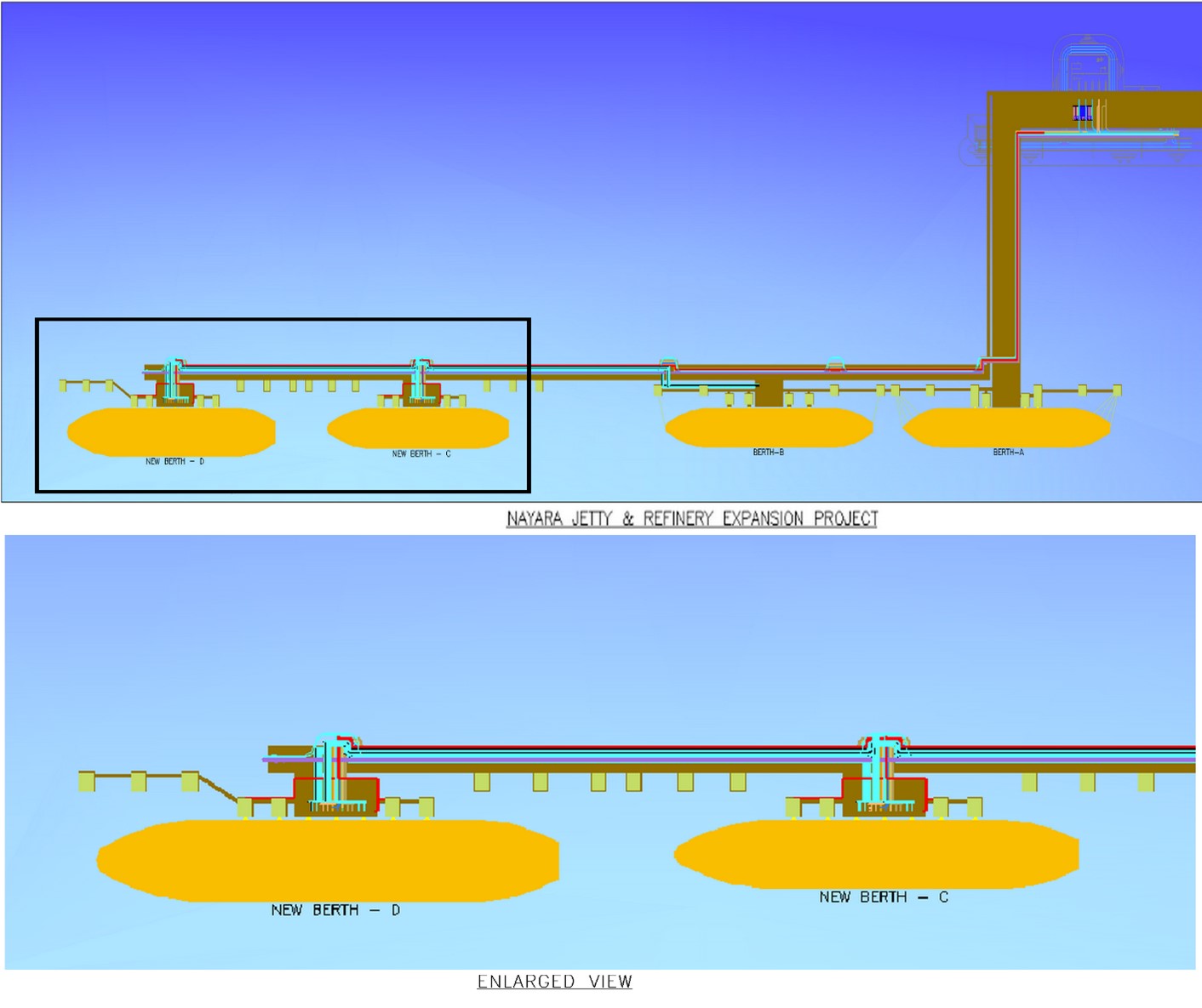 NAYARA is planning to expand current Jetties (Berth A & B) to handle additional Crude and Products for future Refinery capacity expansion to 46 MMTPA along with Petrochemical Plants, it is proposed to install one SPM(SPM2) along with offshore (subsea) Crude pipeline for unloading additional Crude and two additional liquid cargo berths (Berth C & D) for dispatch of Petroleum and Petrochemical Products and import of Feed products like Naphtha, Propane and Butane for Petrochemical.